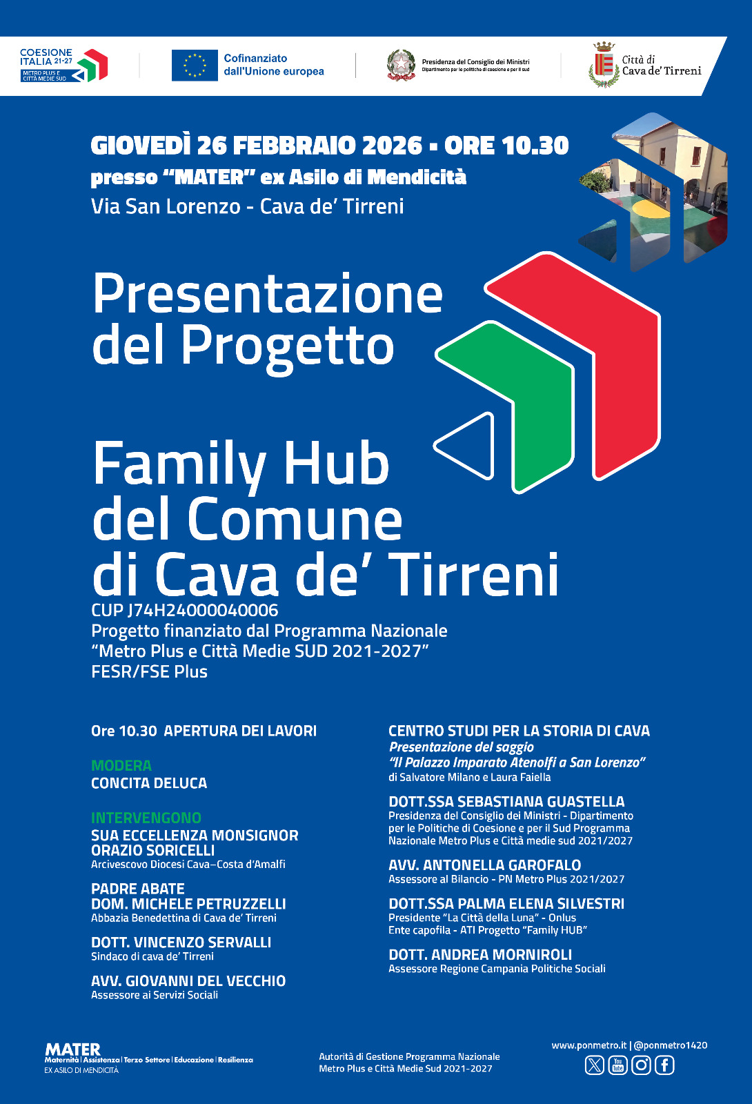 Cava de’ Tirreni è la prima città delle trentanove comprese nel Programma PN Metro Plus Città Medie 2021-2027, a partire con un progetto. Ad annunciarlo, la dott.ssa Sebastiana Guastella del Dipartimento per le Politiche di Coesione e per il Sud, presso la Presidenza del Consiglio dei Ministri nel corso della presentazione che si è tenuta presso “MATER” ex Asilo di Mendicità a S. Lorenzo.